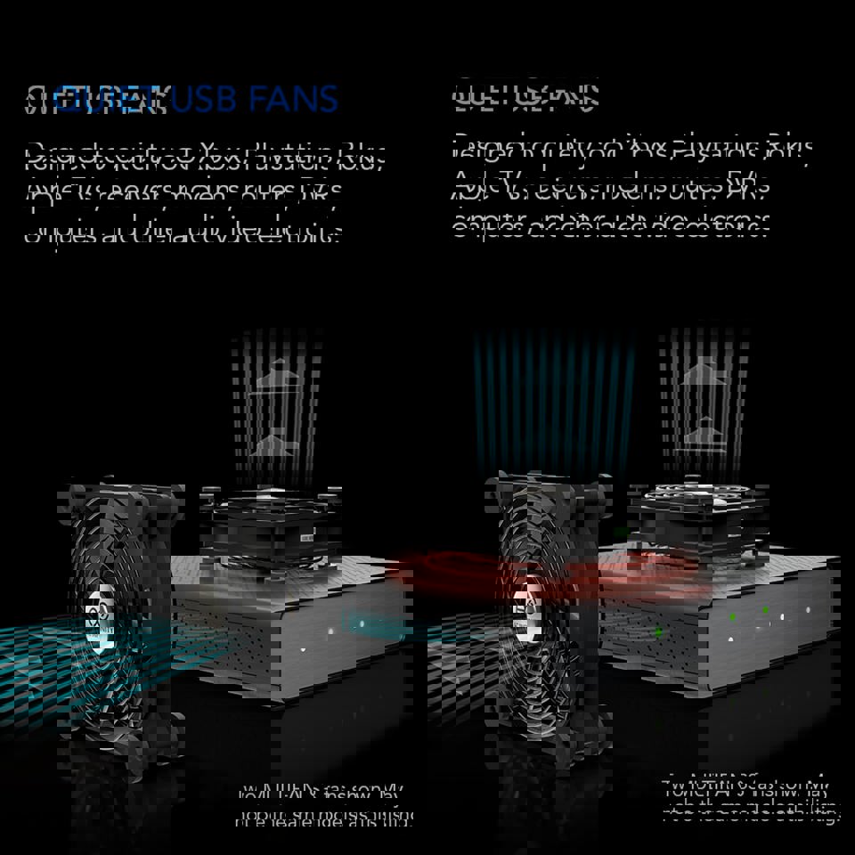 The small cooling fan can be positioned to stand upright or laid flat to cool various electronics and ventilate DIY projects. Features a multi-speed controller with power switch. Includes anti-vibration rubber feet and a 6-foot power cord. The low power-consumption fan be be powered by USB ports found behind popular electronics and on portable power banks. Each unit contains an additional USB port, up to four fans can be daisy chained together to share the same power source. This fan system is CE and RoHS certified and contains premium dual-ball bearings, allowing it to be mounted horizontally or vertically.