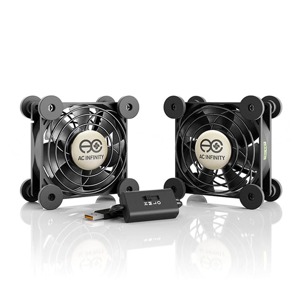 The ultra-quiet cooling fans can be positioned to stand upright or laid flat to cool various electronics and components. Features a multi-speed controller with power switch. Includes eight large anti-vibration rubber feet per fan and a 6-foot power cord. The USB plug can be plugged into the USB ports found behind popular electronics such as receivers and video game consoles. The two fans are permanently connected by a 2.5 feet cord and share the same multi-speed controller. Each unit contains an additional USB port, up to four fans can be daisy chained together to share the same power source. This fan system is CE and RoHS certified and contains premium dual-ball bearings, allowing it to be mounted horizontally or vertically. Contains AC Infinity axial fans ACX-FD8025(B)05W5 which meet UL-507 standards for safety under Underwriters Laboratories certificate E503903.